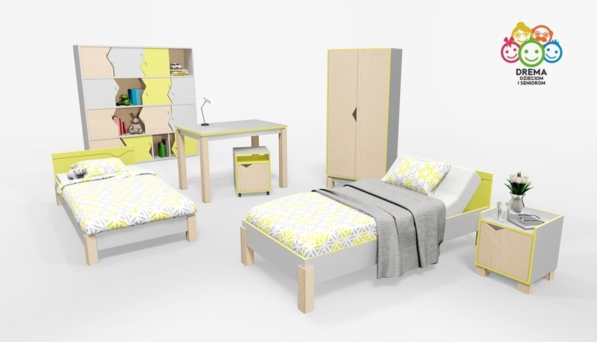 - Skafander pozwala odczuć fizyczne ograniczenia wynikające z wieku, co znalazło odzwierciedlenie w ergonomii rozwiązań zastosowanych przy projektowaniu łóżek, szaf czy stołów wchodzących w skład zestawów – mówi dr inż. Krzysztof Wiaderek z Katedry Meblarstwa Wydziału Technologii Drewna UP, współorganizator i koordynator akacji „DREMA dzieciom i seniorom”. – Studenci WTD kierunku Projektowanie mebli: Agata Gołębiewska, Bartosz Sumionka, Daniela Winiecka i Paulina Molska stworzyli dwa warianty tego samego zestawu meblowego, które mają zostać wyprodukowane przy zastosowaniu tego samego parku maszynowego, ale ich użytkownikami mają być dwie zupełnie różne grupy wiekowe: dzieci i seniorzy.