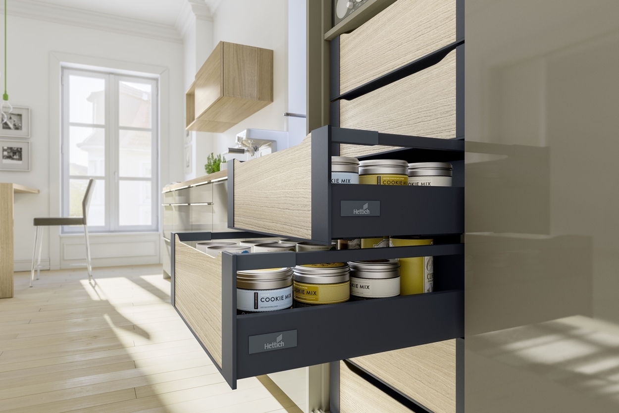 W kwestii szuflad moda nie przemija. Tu króluje najwyższa jakość, trwałość i moc! Warto postawić na solidne prowadnice Quadro lub Actro oraz systemy szuflad InnoTech Atria (obciążenie do 50 kg), AvanTech YOU i ArciTech (obciążenie do 70 kg). Dzięki nim możemy tworzyć zindywidualizowane rozwiązania – od szuflad bardzo szerokich, po te ukryte. Jednym frontem możemy zasłonić kilka mniejszych szuflad, a także zabudować nimi wysokie słupki, tworząc kuchenną spiżarnię. Przezroczyste boki z tworzywa lub szkła pozwolą łatwo odnaleźć właściwe produkty spożywcze.